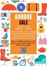 As a fundraiser for the Guatemala Mission Trip in 2027, Mammoth Baptist Church is offering church members and close relatives an opportunity to host their garage sales for the Meeker City-Wide Garage Sale on the church grounds on May 9th, 2026, from 8:00AM - 5:00PM. If you would like to host your sale at MBC, please click the link below to view more details and to register.
