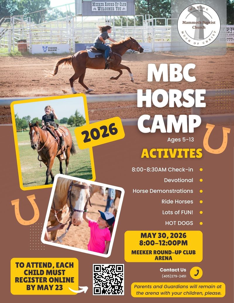 Each child attending MBC Horse Camp will need a new form completed. To attend, all attendees must register online by May 23rd, 2026, there will be no late registrations. This event is limited to 125 children. Thank you, we appreciate your understanding.