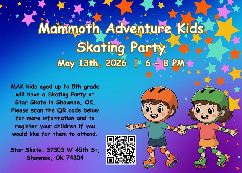 On Wednesday, May 13th, 2026, from 6:00-8:00PM, Mammoth Kids aged up to 5th grade will have a Skating Party at Star Skate in Shawnee, OK. Please register your children below if you would like for them to attend.
