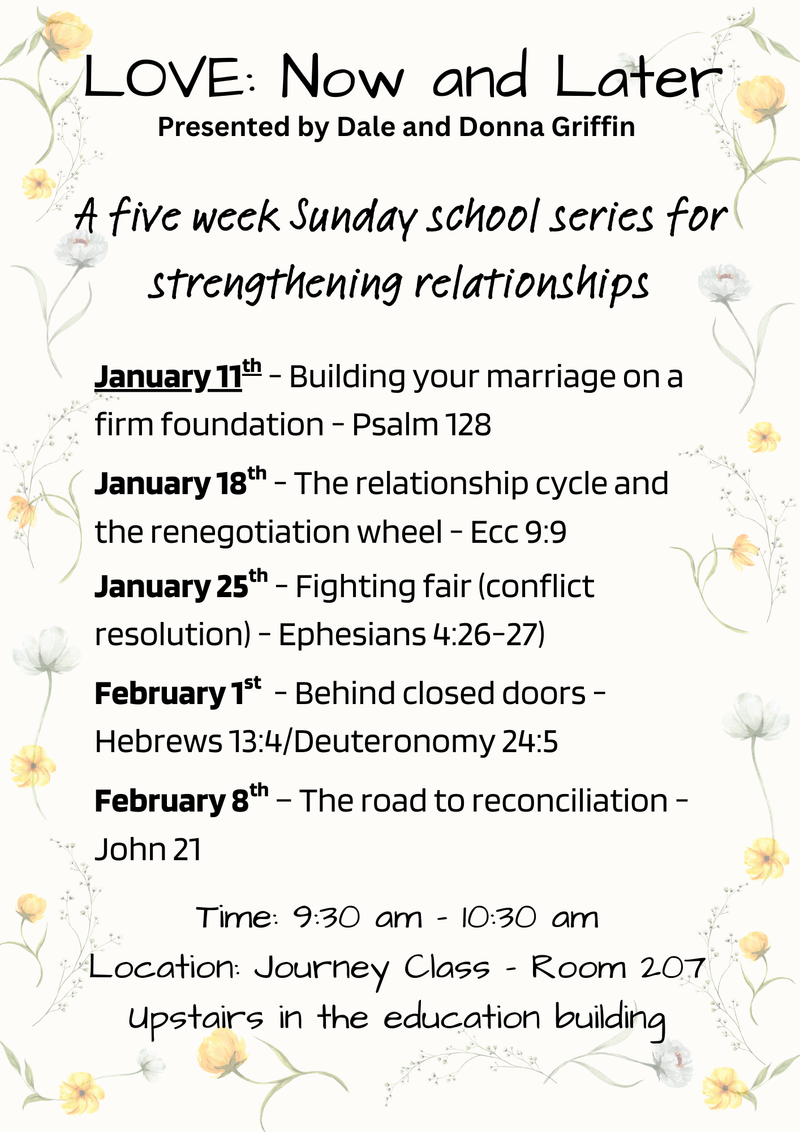 Join our new 5-week Sunday School series, "LOVE: Now and Later," presented by Dale and Donna Griffin. All are welcome, whether you are currently in a relationship or not. The first session begins Sunday, January 11th, at 9:30AM in room 207 of the education building.
