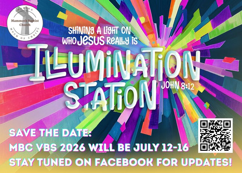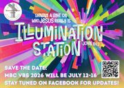 Save the Date! Vacation Bible School 2026 will be July 12-16. The theme this year is "Illumination Station" where we will Shine a Light on who Jesus really is!